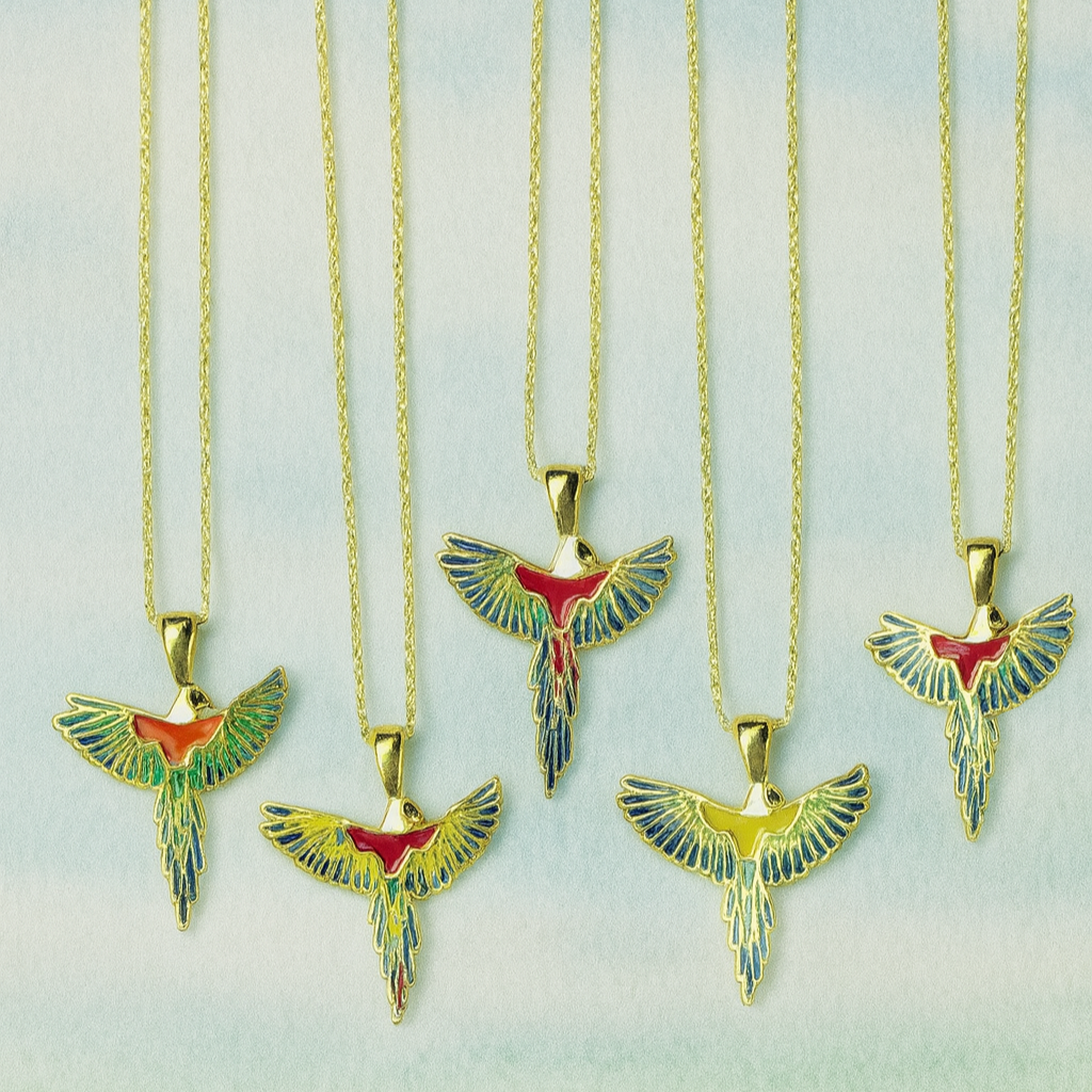 Este collar de guacamaya está hecho en Zamac con baño de oro (libre de níquel ) y pintadas a mano con resinas de colores.